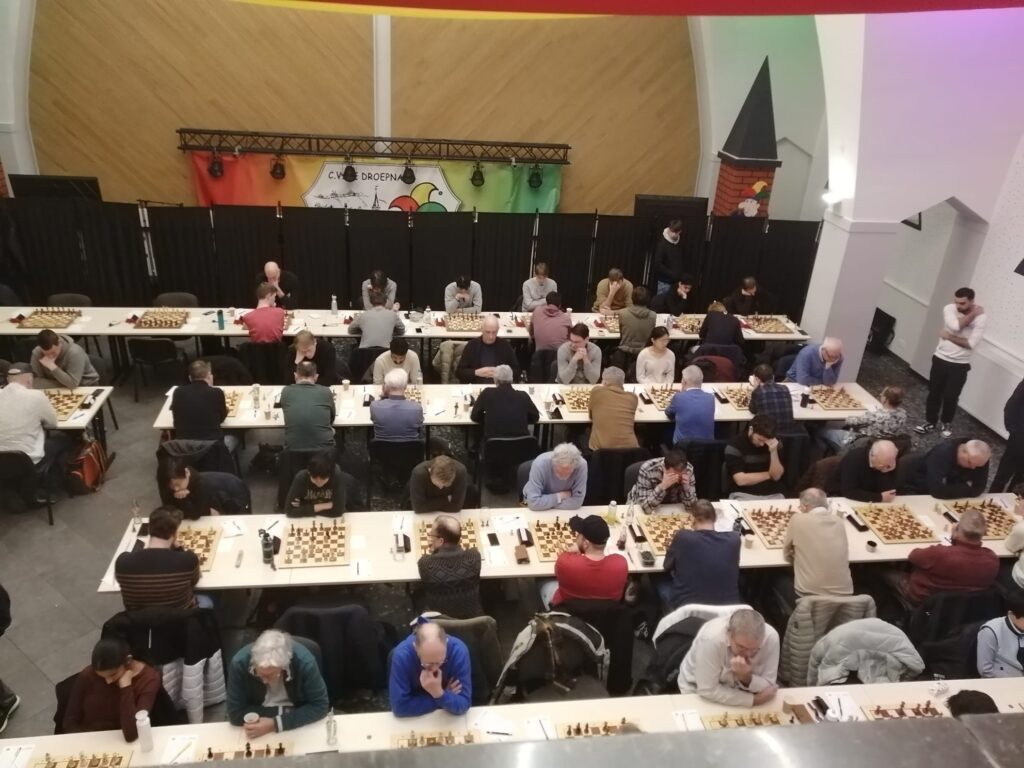Ergens na de 40e zet kreeg Henk voor de 2e keer een remiseaanbod. Hij vroeg me wat te doen en ik vertelde hem dat Max inmiddels dik verloren stond en dat bij aanname van het aanbod de wedstrijd in 4:4 zou eindigen en dat Henk zelf mocht beslissen wat te doen. En toen pakte Henk de strijdbijl dus weer op! Het bleef heel lang volkomen gelijk maar het venijn zat dus in de staart. In een heel moeilijk eindspel van K + T + P + 2 pionnen (wit) tegen K + 2T (zwart) ging de zwartspeler op de 84e zet als eerste in de fout (84…Th8 i.p.v. 84…Tbb4 ). De winstweg was echter zeker niet eenvoudig. Zeker als je bedenkt dat er al ruim 5 uren was gespeeld en beide spelers nog slechts enkele minuten plus increment over hadden. Het is dan ook volkomen begrijpelijk dat in het vervolg door beide spelers een paar keer de beste voortzetting werd gemist. Als laatste was dit de zwartspeler die met 96…Th8 ipv 96…Th5 de partij definitief uit handen gaf. 1-0 na ruim 100 zetten. Pfffff