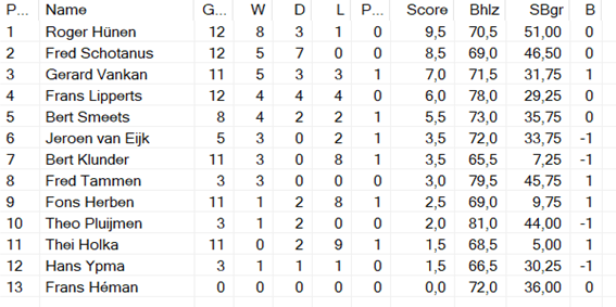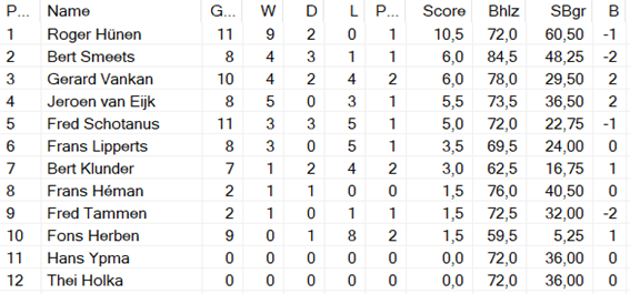 Ook deze periode werd gewonnen door Roger, met Bert Smeets op zijn eigenlijk gebruikelijke 2e plaats. Ik denk dat ik in deze periode voor het eerst helemaal afwezig was. Gerard van Kan scoorde evenveel punten als Bert, maar had daar 2 partijen meer voor nodig.