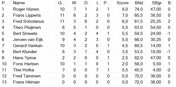 Zoals gebruikelijk heeft Roger deze periode winnend afgesloten. Verder valt de hoge score van voornaamgenoot Fred Schotanus op, die Roger een aantal remises afgedwongen heeft. En mijn score, 3 uit 3. Mijn tegenstanders waren kennelijk blij met mijn hernieuwde aanwezigheid en maakten het mij niet al te moeilijk.