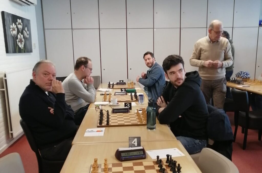 Tijdens het eten komen de uitslagen binnen en wat blijkt… We staan eerste met 7 matchpunten en 19.5 bordpunten uit 4 wedstrijden. De volgende ronde spelen we thuis een derby tegen het sterke ‘t Pionneke. Komt dat zien!