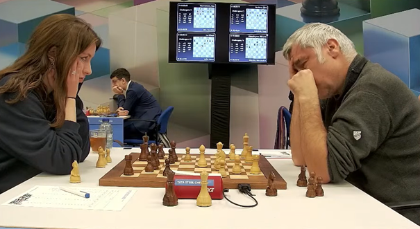 De enige dame in de ontmoeting speelde tegen de speler met de laagste rating van Charlois Europoort. Ze kwam sterk uit de opening en won na het (voor mij) onbegrijpelijke 24…h6 een pion. Maar ze verspeelde haar voordeel weer. Totdat de tegenstander in het eindspel op zet 50 blunderde. En daarna maakte ze het technisch keurig af.