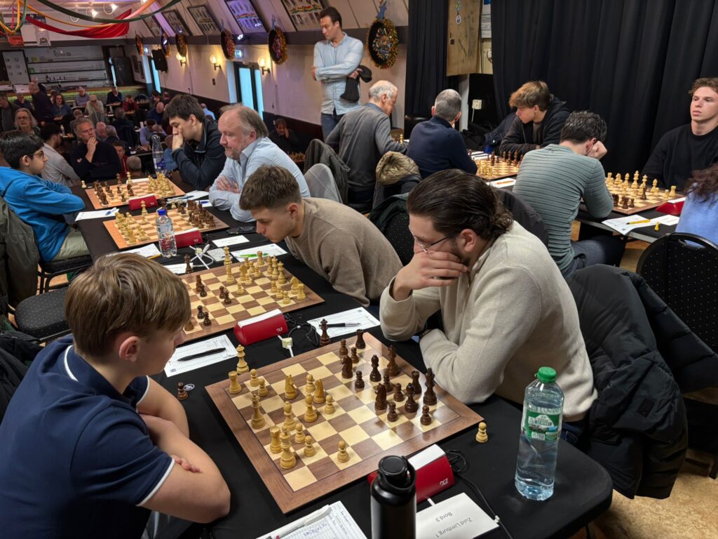 Maar op naar de huidige wedstrijd in ronde 5: Zuid Limburg 1- HMC Den Bosch 1. De wedstrijd werd gespeeld op het podium in de zaal en de partijen waren, dankzij Roger, te volgen op internet. Een viertal partijen waren spectaculair holder-de-bolder schaak en hadden even goed anders kunnen uitpakken, absolute thrillers (Lennert, Philipp, Carlo en Fatih). Twee partijen waren spannend maar vooral kansen voor onze kant (Valentin en Luca) en vier partijen waren min of meer logische remises waar onze spelers in de meeste partijen een tikje minder stonden maar goed wisten stand te houden (Alex, Ruud, Daniel en Daniel).